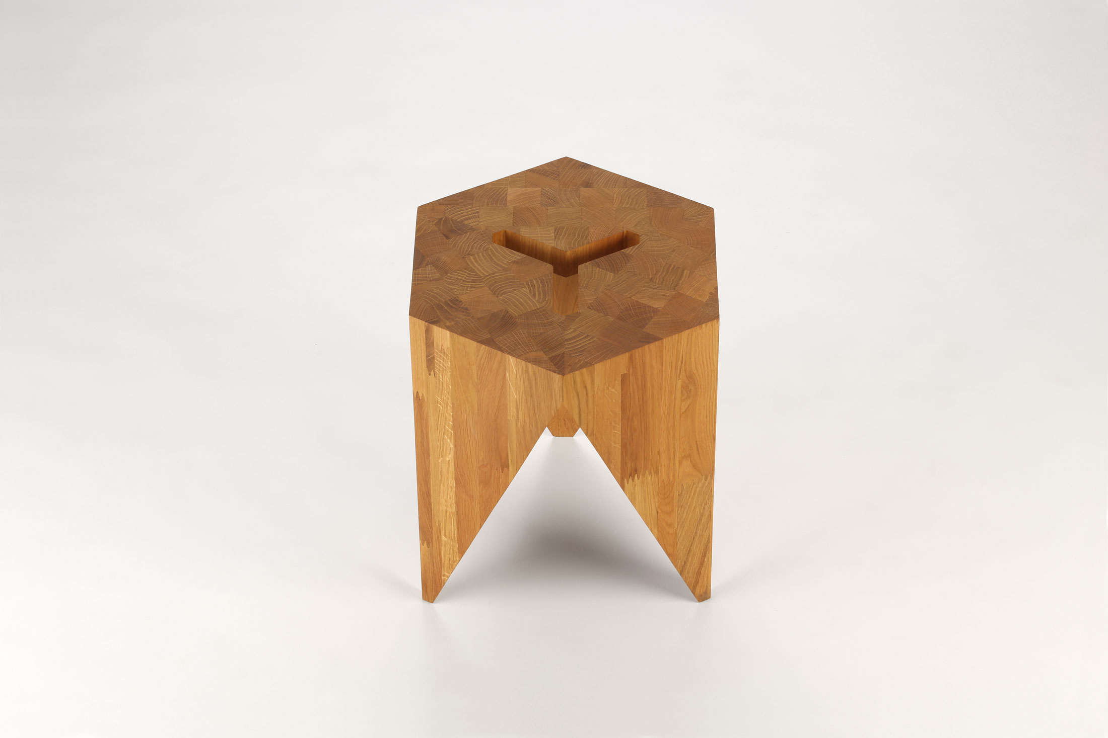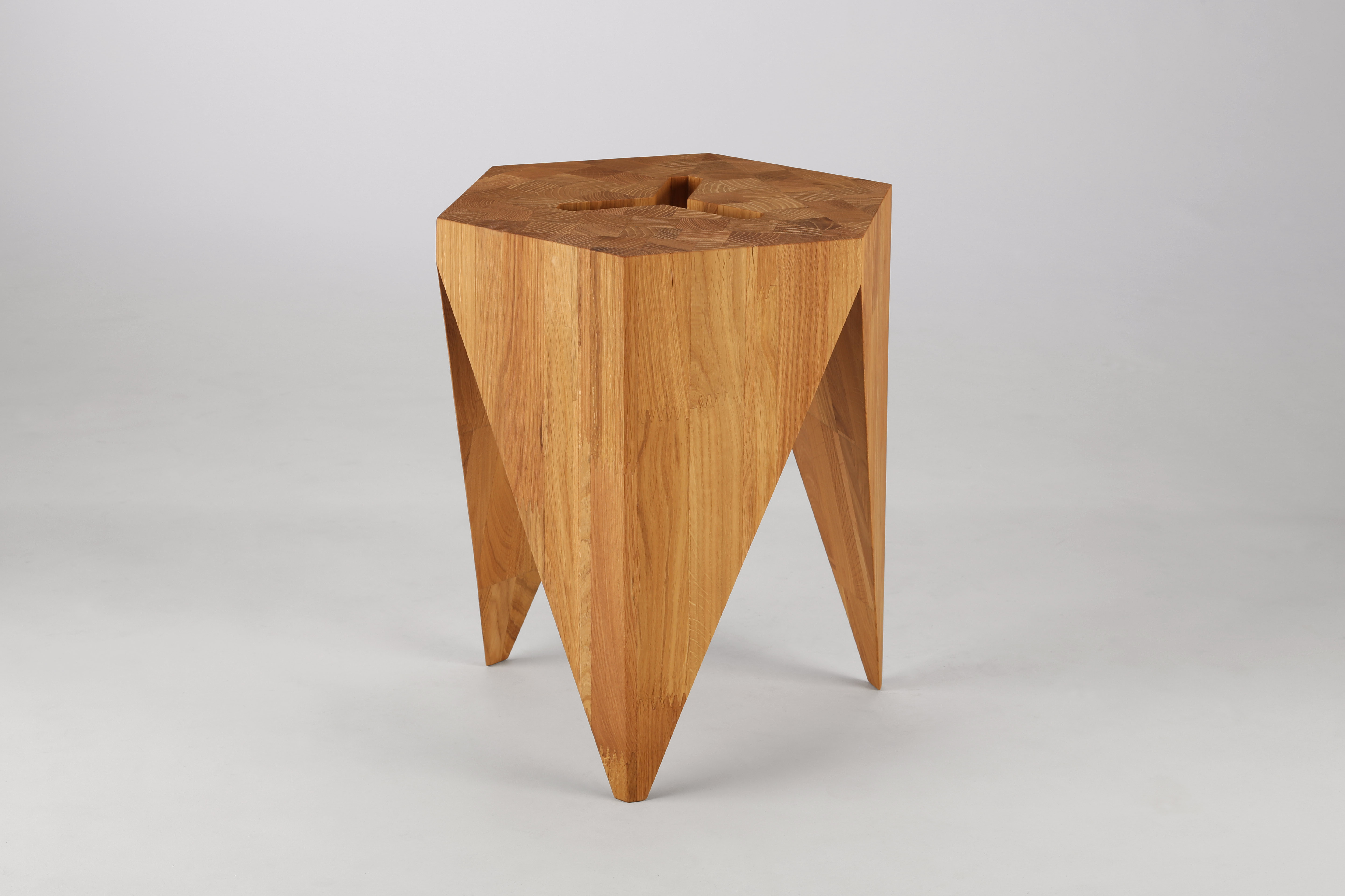 Solid wooden stool of contemporary design with distinctive straight lines. The hexagonal seat passes seamlessly to three legs, giving the stool a unique ‘inverted crown’ expression. The seat and legs are not separate parts, but comprise a whole monolithic form. This demanding product of carpentry will stand in any space as a genuine artwork.