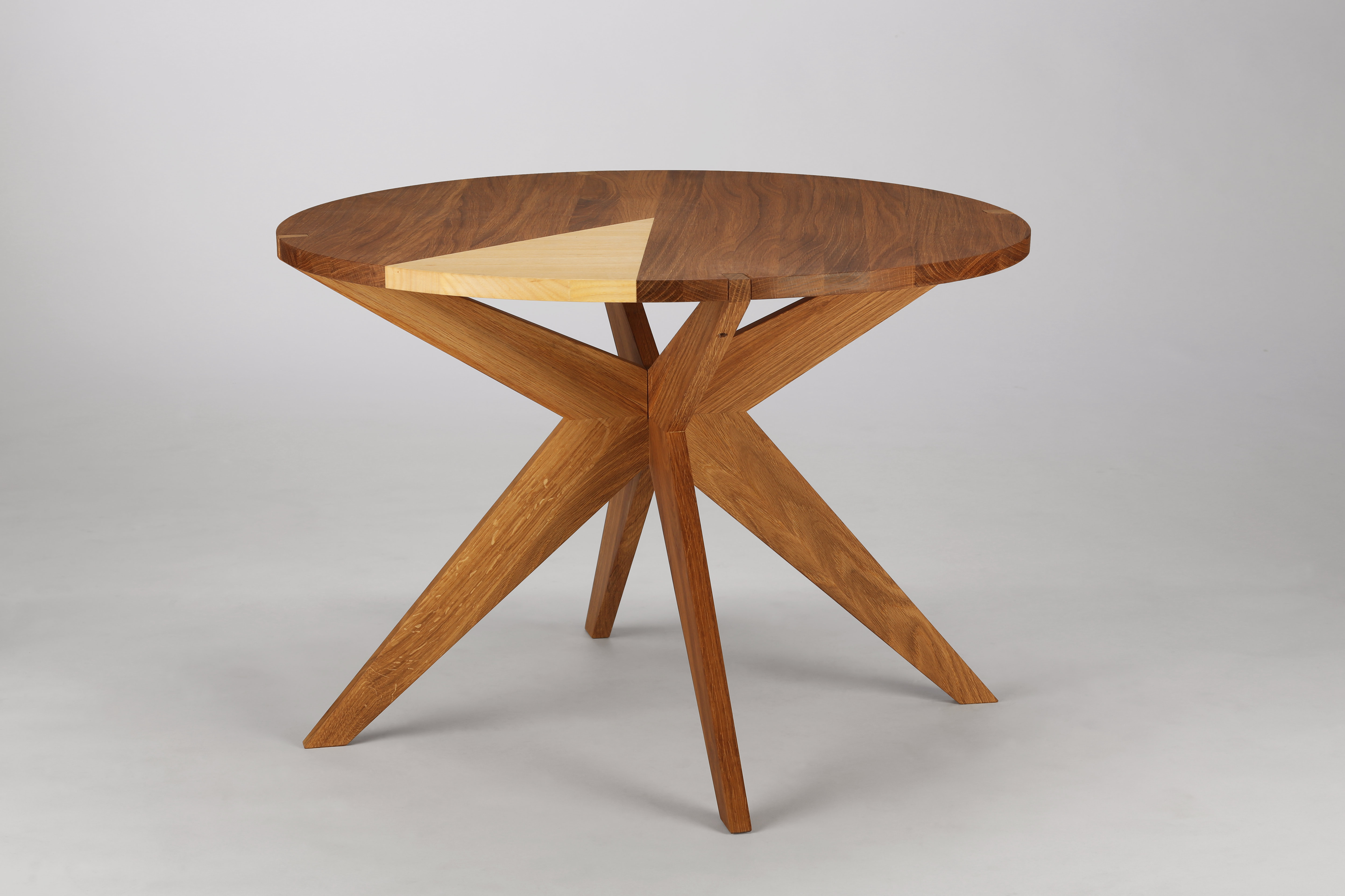 This spacious tea table has a large round surface. Special emphasis is expressed by the double X form of its legs, which is reflected as a detail on the table’s top surface. Interleaved legs give the table a unique and classical expression with a modern touch.